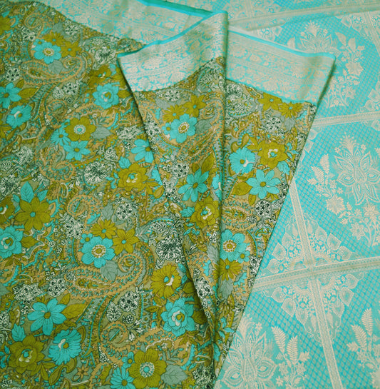 Indian Vintage Sari Green & Blue 100% Pure Silk Printed Sarees 5yd Sewing Craft Fabric Dress Making Soft Wrap Crafting Quilting Upcycle