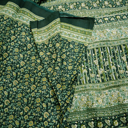 Vintage Sari Green 100% Pure Silk Printed Saree Fabric 5yard Sewing Soft Dress Designing for Crafting ,Decor