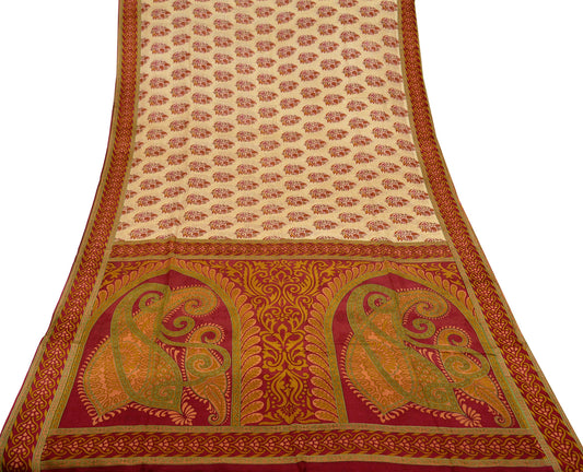 Indian Vintage Sari Red & Beige 100% Pure Silk Printed Sarees 5yd Craft Fabric Sewing Soft Dress Making Paisley Quilting Upcycle Crafting