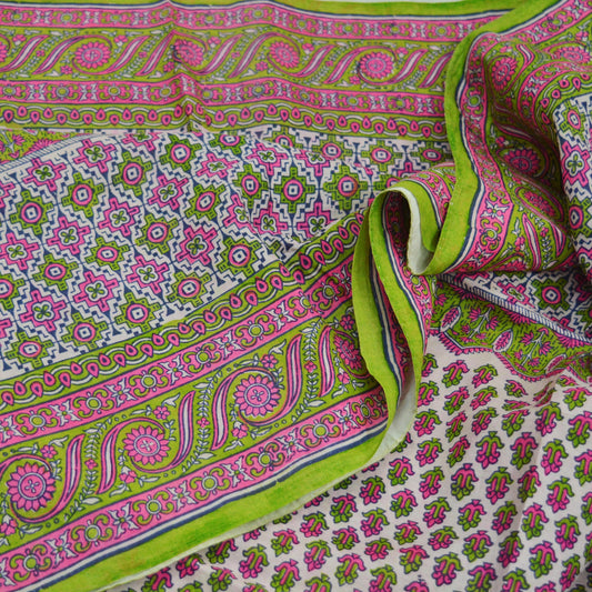 Indian Vintage Sari Ivory & Green Pure Silk Printed Sarees 5yd Sewing Craft Fabric Dress Making Soft Crafting Quilting Upcycle old Paisley