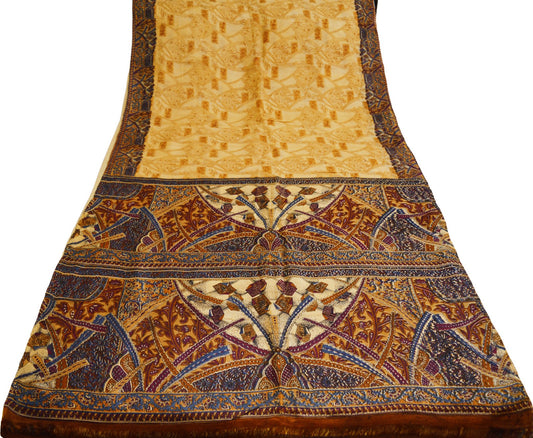 Indian Vintage Sari Beige Pure Silk Printed Saree 5yd Sewing Craft Fabric DressMaking Geometric Wrap Upcycle Used Quilting
