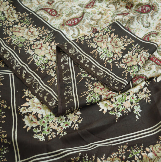 Vintage Sari Brown & Ivory 100% Pure Silk Printed Saree Fabric 5yard Sewing Floral Soft Dress Designing for Crafting