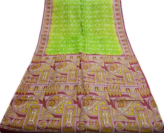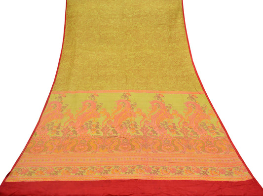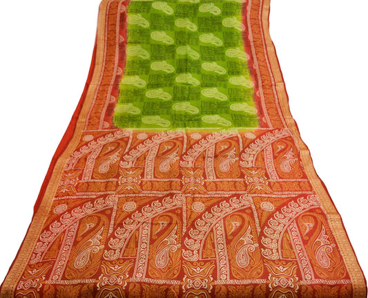 Indian Vintage Sari Green & Saffron 100% Pure Silk Printed Sarees Fabric 5yd Sewing Craft Fabric DressMaking Soft
