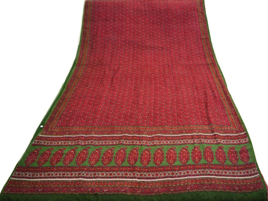 Indian Vintage Sari Maroon & Green Pure Silk Printed Saree Fabric 5yard Sewing Craft DressMaking