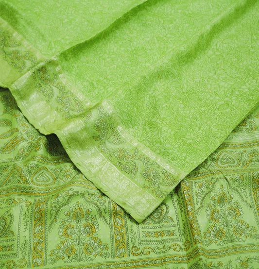 Indian Vintage Sari Green Pure Silk Printed Saree 5yard Sewing Craft Fabric DressMaking Soft Golden Zari