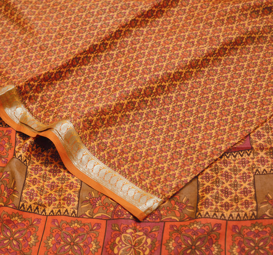 Vintage Sari Orange & Brown 100% Pure Silk Printed Saree 5yard Sewing Fabric Soft Dress Designing for Crafting ,Decor