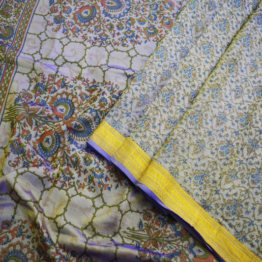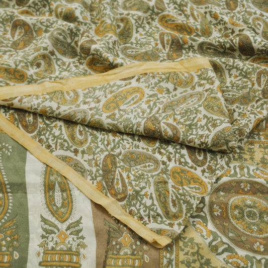 Indian Vintage Sari Ivory & Green Pure Silk Printed Sarees 5yd Sewing Craft Fabric Floral Dress Making Soft Quilting Upcycle Crafting Used