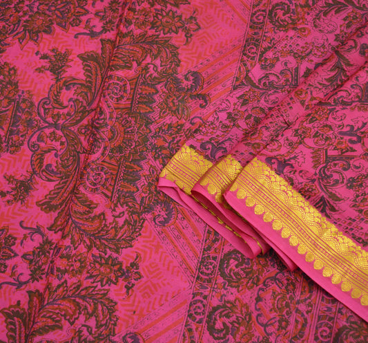 Vintage Sari Rani Pink 100% Pure Silk Printed Sarees Fabric 6yard Sewing Paisley Soft Dress Designing for Crafting