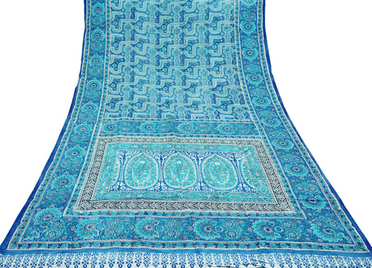 Indian Vintage Sari Blue Pure Silk Printed Saree 5yard Sewing Craft Fabric Dress Making Soft Wrap Floral Zari