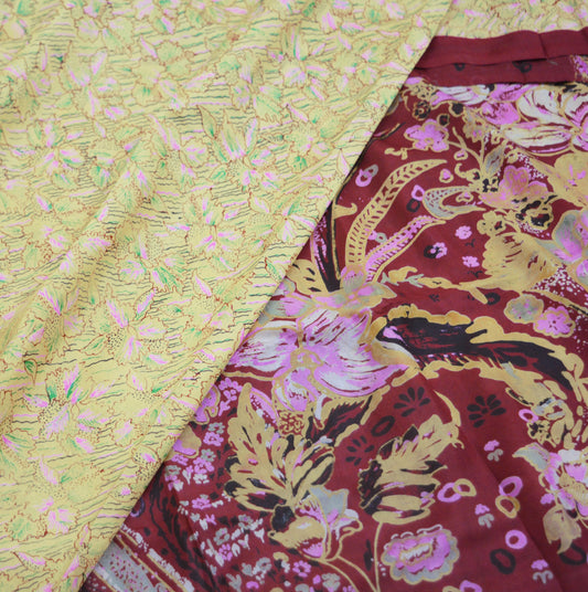 Indian Vintage Sari Maroon & Yellow Pure Silk Printed Saree 5yd Sewing Craft Fabric DressMaking Soft