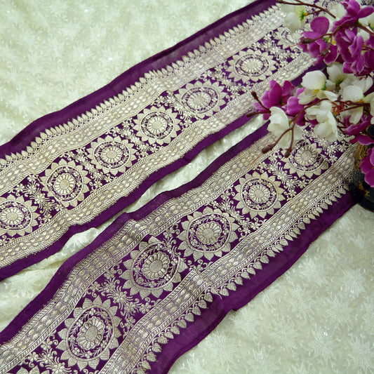 Indian Vintage Purple Sari Border Hand Embroidered Indian Craft Trim Lace Sewing Sari Ribbon Pure Crepe silk Zardozi/Dabka Zari
