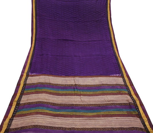 Indian Vintage Purple Saree Pure Crepe Silk Hand Embroidered Sari Craft Fabric 5Yd Sewing Soft Zari Dress making