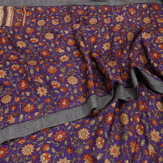 Indian Vintage Sari Purple Pure Crepe Silk Hand Embroidered Saree 5yd Sewing Floral Craft Sequins Dress making Crafting Quilting