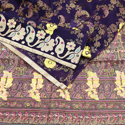 Indian Vintage Sari Blue & Purple Blend Silk Woven Digital Printed Saree Craft Fabric 5yd Soft Dress Designing Crafting Quilting Zari Border