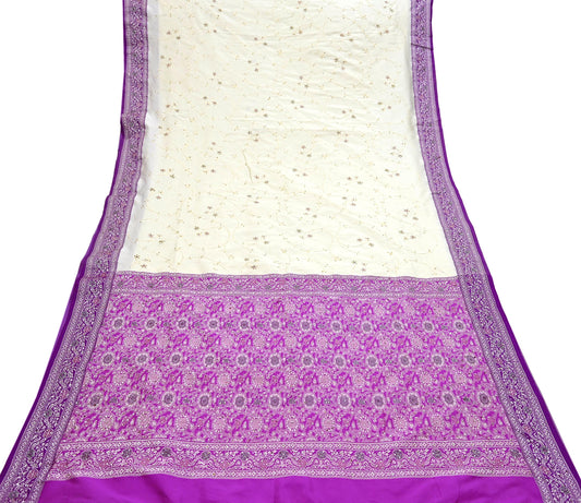 Indian Vintage Sari Purple & White Artificial Silk Hand Embroidered Sarees Craft Fabric 5Yd Sewing Soft Sequins Upcycle Dress Making