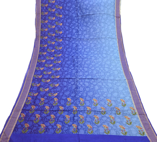 Indian Vintage Sari Blue & Purple Kalamkari Printed Pure Cotton Saree Fabric Soft Floral 5Yd Sarong Wrap Fabric Peacock