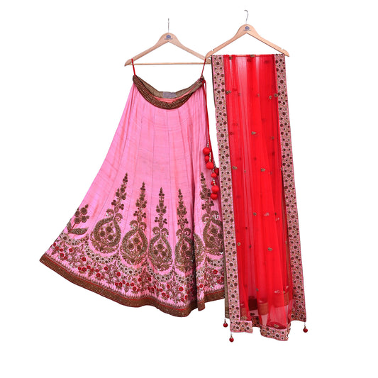 Indian Heavy Pink Red Raw Silk & Net Hand Embroidered Lehenga 3pcs Set Designer By Manish Malhotra Party Wear