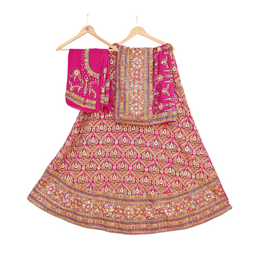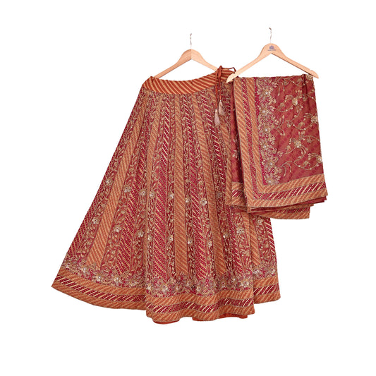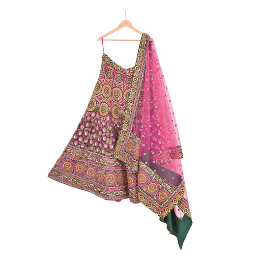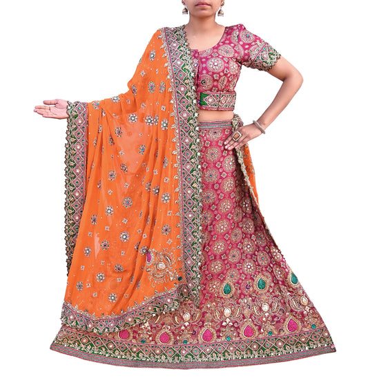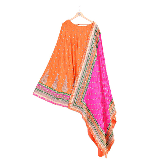 Indian Pre-owned Heavy Rani Pink & Orange Pure silk Hand Embroidered Lehenga Set Of 2pcs Designer By Manish Malhotra Party Wear