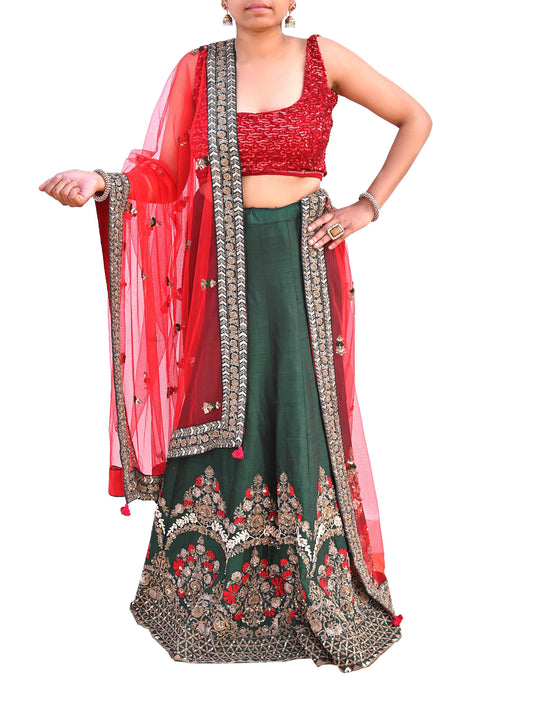 Indian Heavy Red & Bottle Green Raw Silk/Net Hand Embroidered Lehenga 2pcs Set By Designer Sabyasachi Bridal Wear