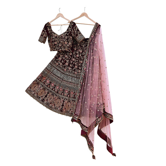 Indian Heavy Wedding maroon & pink Net/ velvet Hand Embroidered Lehenga 3pcs Set Designer By Manish Malhotra Party Wear