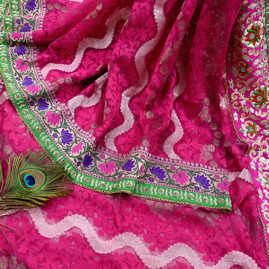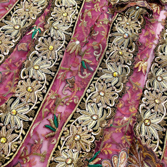 Indian Vintage Heavy Wedding Pink Net/Mesh/ Velvet Hand Embroidered Dupatta Designer By Anamika Khanna Bridal Wear Dabka Zardozi Veil Hijab