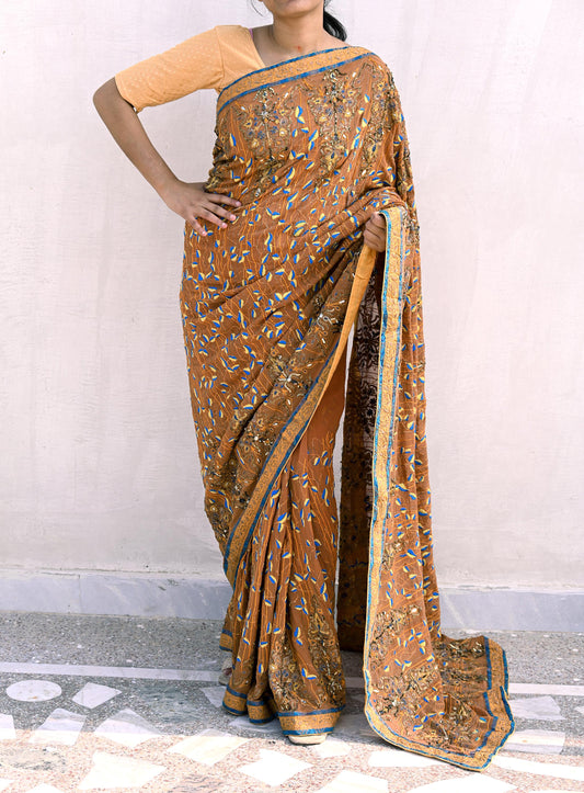Indian Pre-owned Heavy Sari Brown Pure Georgette Silk Hand Embroidered Kantha Sarees Designer Abu Jani 6Yd Sewing Ethnic Sarees