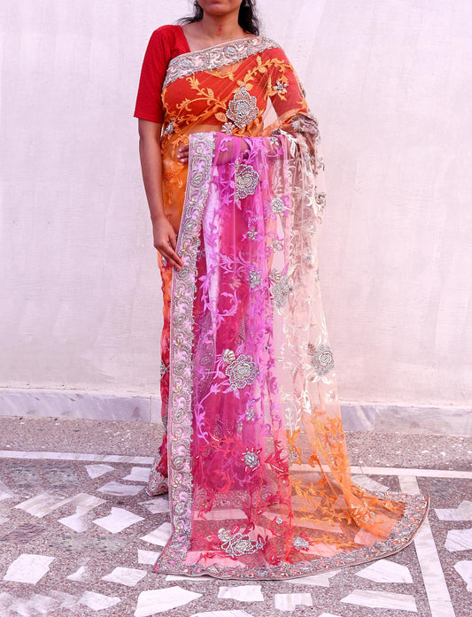Indian Pre-owned Sari Multi Net/Mesh Hand Embroidered Anamika Khanna Designer Sarees Ethnic 5Yd Sewing Zardozi/Dabka Zari Wedding Sarees