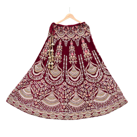 Indian Pre-owned Heavy Wedding Maroon Velvet Hand Embroidered Lehenga/Skirt Designer By Anamika Khanna Bridal Wear