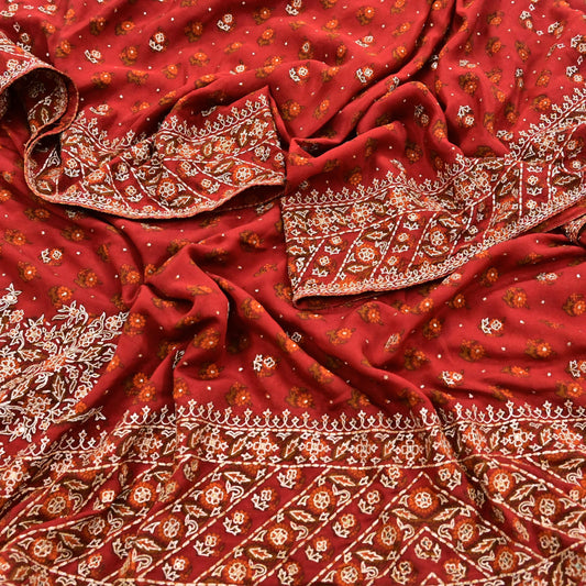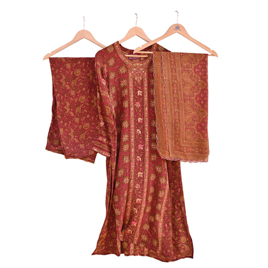Indian Pre-Owned Rusty Red Pure Silk Hand Embroidered Ritu Kumar Designer 3 Piece Suit Set (Kurta + Dupatta + Salwar)