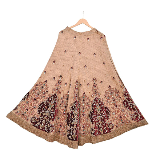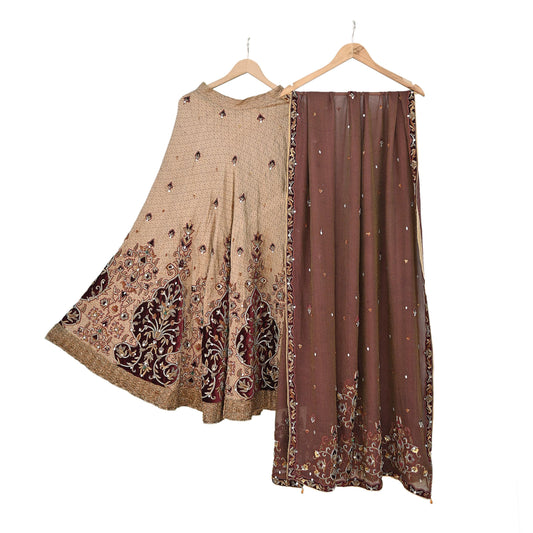 Indian Pre-owned Heavy Beige & maroon Organza/Pure Satin silk Hand Embroidered Lehenga/Dupatta/Choli Designer By Tarun Tahiliani