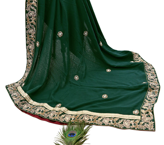 Indian Vintage Heavy Bottle Green Pure Georgette Silk Hand Embroidered Dupatta Designer By Anamika Khanna Bridal Wear Dabka Veil Hijab