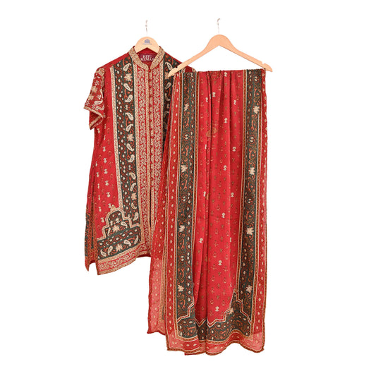 Indian Pre-Owned Red & Green Pure Silk Hand Embroidered Ritu Kumar Designer 2 Piece Suit Set (Kurta + Dupatta)