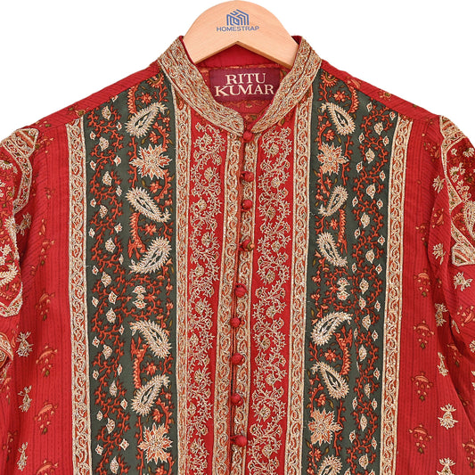 Indian Vintage Red & Green Ritu Kumar Pure Silk Kurta Hand Embroidered Printed Designer Ethnic Festive Party Wear Tunic