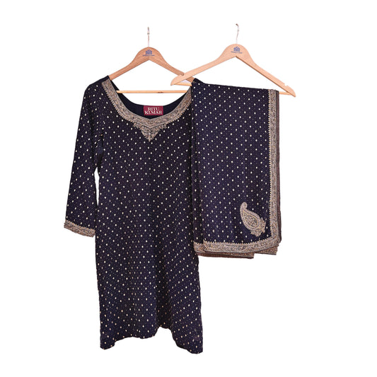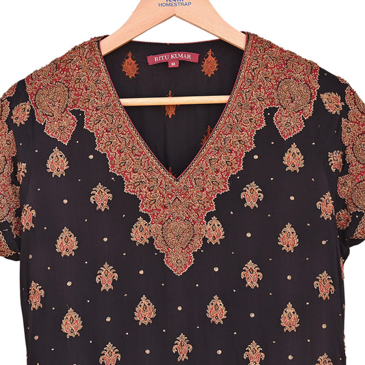 Indian Pre-Owned Black Pure Crepe Silk Hand Embroidered Ritu Kumar Designer 2 Piece Suit Set (Kurta + Dupatta)