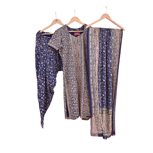 Indian Pre-Owned Blue & Ivory Pure Silk Hand Embroidered Ritu Kumar Designer 3 Piece Suit Set (Kurta + Dupatta + Salwar)