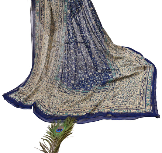 Indian Vintage Blue & Ivory Dupatta Pure Chiffon Silk Long Stole Hand Embroidered Designer By Ritu Kumar Scarves Scarf Zari Zardozi