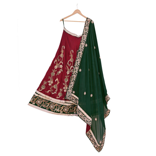 Indian Pre-Owned Party Wear Green & maroon Raw Silk, Pure Georgette Silk Hand Embroidered Lehenga 2pcs Set Designer By Anamika Khanna