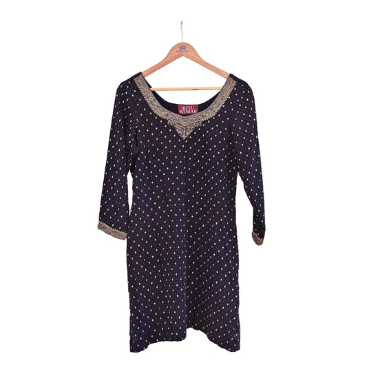 Indian Vintage Ritu Kumar Deep Blue Pure Crepe Silk Long Kurta Hand Embroidered Printed Designer Ethnic Festive Party Wear Tunic