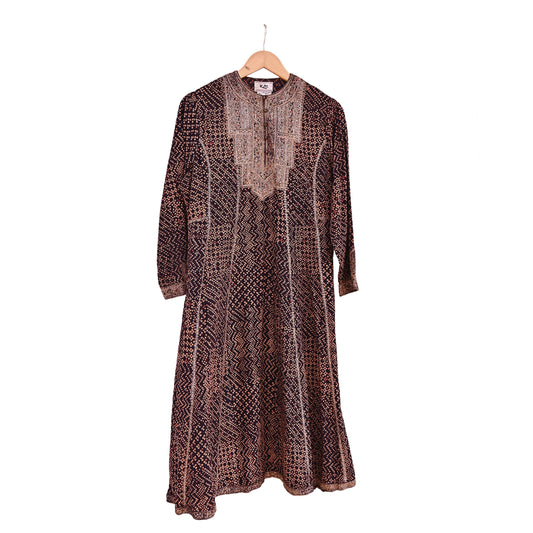 Indian Vintage Ritu Kumar Brown Pure Crepe Silk Long Kurta Hand Embroidered Printed Designer Ethnic Festive Party Wear Tunic