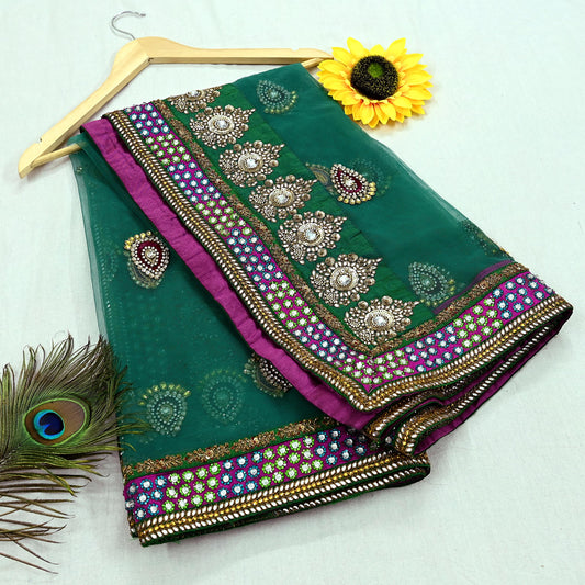 Indian Pre-Owned Sari Green Net/Mesh Hand Embroidered Designer Manish Malhotra Sarees 6Yd Ethnic Zardozi/Dabka Zari Wedding Saree