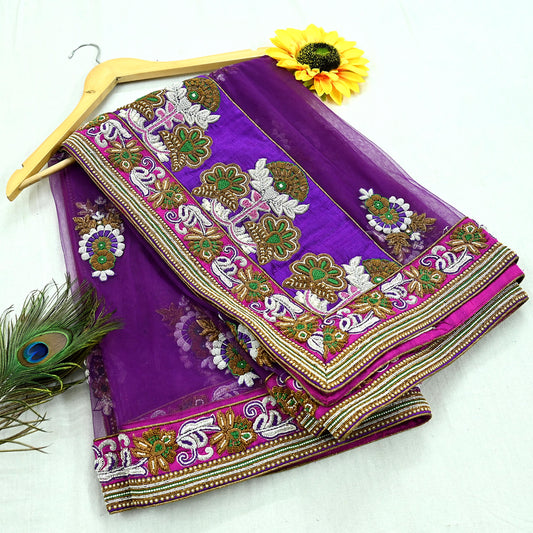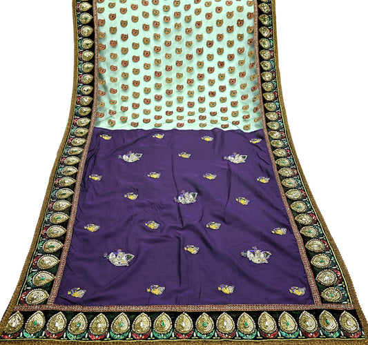 Indian Pre-Owned Sari Purple & Green Net/Mesh Hand Embroidered Brocade Designer Manish Malhotra Lehenga Sarees Ethnic Zardozi Peacock