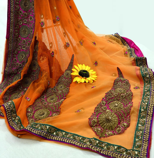 Indian Pre-owned Saree Orange Mesh/Net Hand Embroidered Sabyasachi Designer Sari 6Yd Soft Ethnic Bollywood Party saree