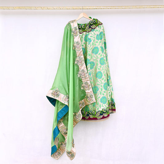Indian Pre-owned Heavy Green Pure Chanderi Silk Hand Embroidered Lehenga Set Of 2pcs Designer By Manish Malhotra Party Wear