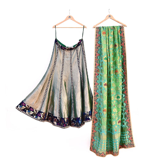 Indian Pre-Owned Party Wear Green & Blue Pure Tissue, Pure Georgette, Satin Hand Embroidered Lehenga 2pcs Set Designer By Anamika Khanna