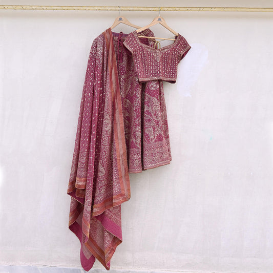 Indian Pre-owned Maroon Pure Silk Hand Embroidered Ritu Kumar Designer Lehenga 3pcs Set Ethnic Bollywood Party Wear