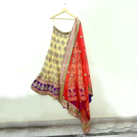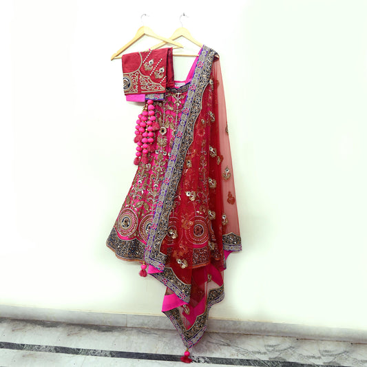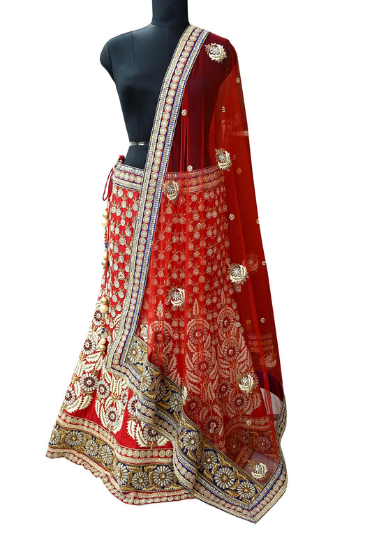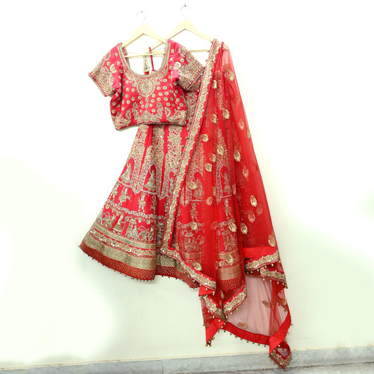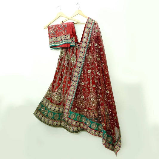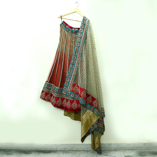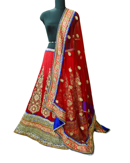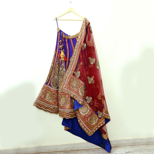 Indian Pre-owned Heavy Red & Blue Pure Chanderi Silk/Net Hand Embroidered Lehenga 3pcs Set By Designer Sabyasachi Bridal Wear With Blouse