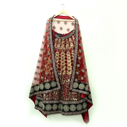 Indian Heavy Wedding Green & Maroon Net/Mesh Hand Embroidered Lehenga 3pcs Set Designer By Anamika Khanna Party Wear