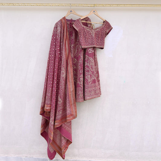Indian Maroon Pure Silk Ritu Kumar Lehenga 3pcs Set Hand Embroidered Bridal Outfit Designer Bollywood Party Wear Ethnic Dress