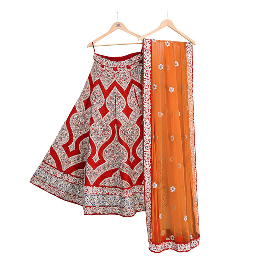 Indian Heavy Hand Embroidered Designer Lehenga Set 2-Piece Anamika Khanna Red Net And Chanderi Silk New Condition