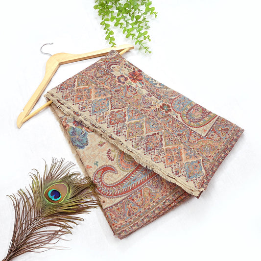 Vintage Beige woolen Shawl Handmade Woven Long Throw Stole Warm Stole Paisley Floral Design Fringes